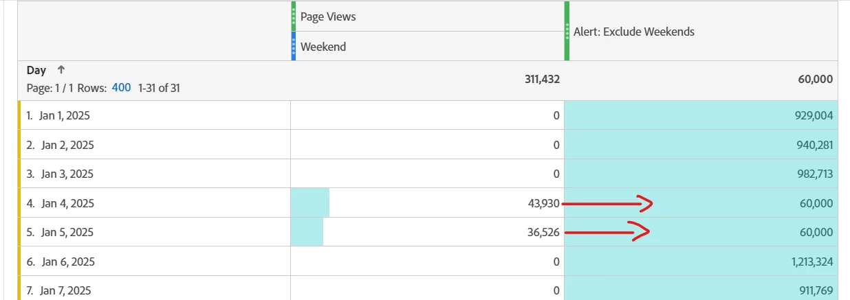 No puede agregar fin de semana/día laborable directamente a la alerta... debe crear un segmento Y una métrica calculada (obligando a que TODOS los datos del fin de semana estén por encima de 52000).