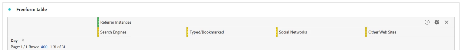 I create a freeform table with Referrer Instances at the top, and that broken down into columns by Referrer Type. Then I use Day as my dimension.