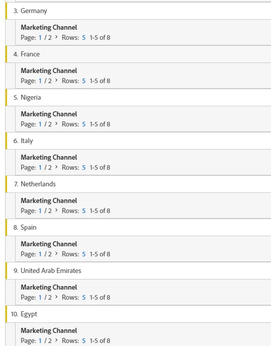 I have a free form table that shows countries (192 rows) and I broke it down by Marketing Channel. The Marketing Channel breakdown by default shows just 5 rows (we need to show 10). Is there an easy way to change rows from 5 to 10 without having to go through each country? Screen shot below. Thanks!