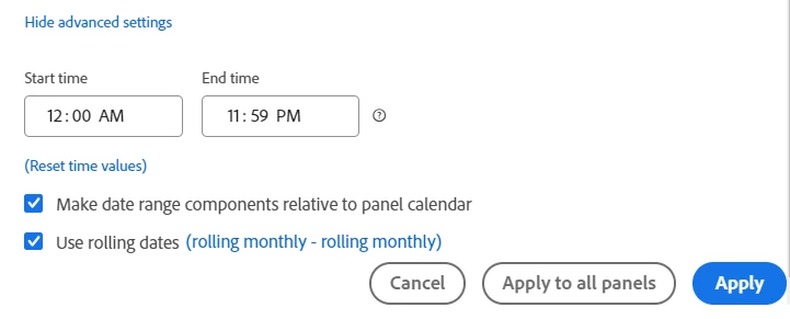 Ideally, I would like to be able to change the panel date range and have the comparison date ranges change automatically but there doesn't seem to be a way to do this.