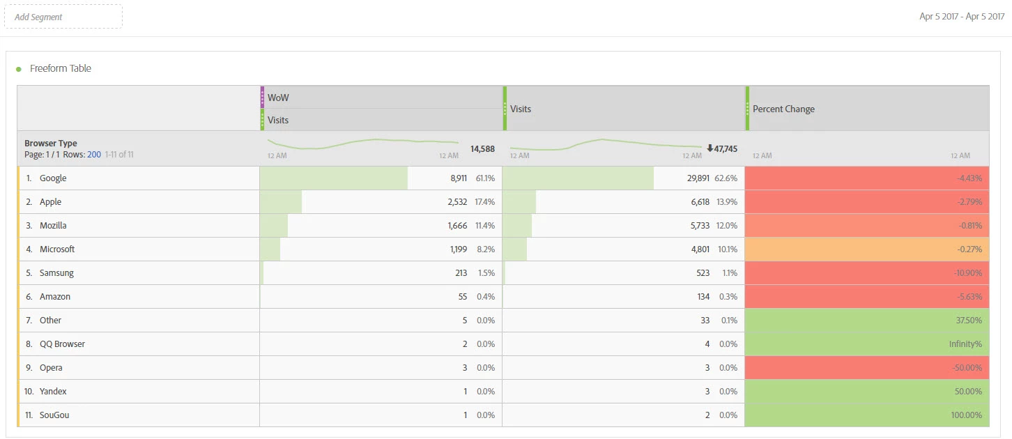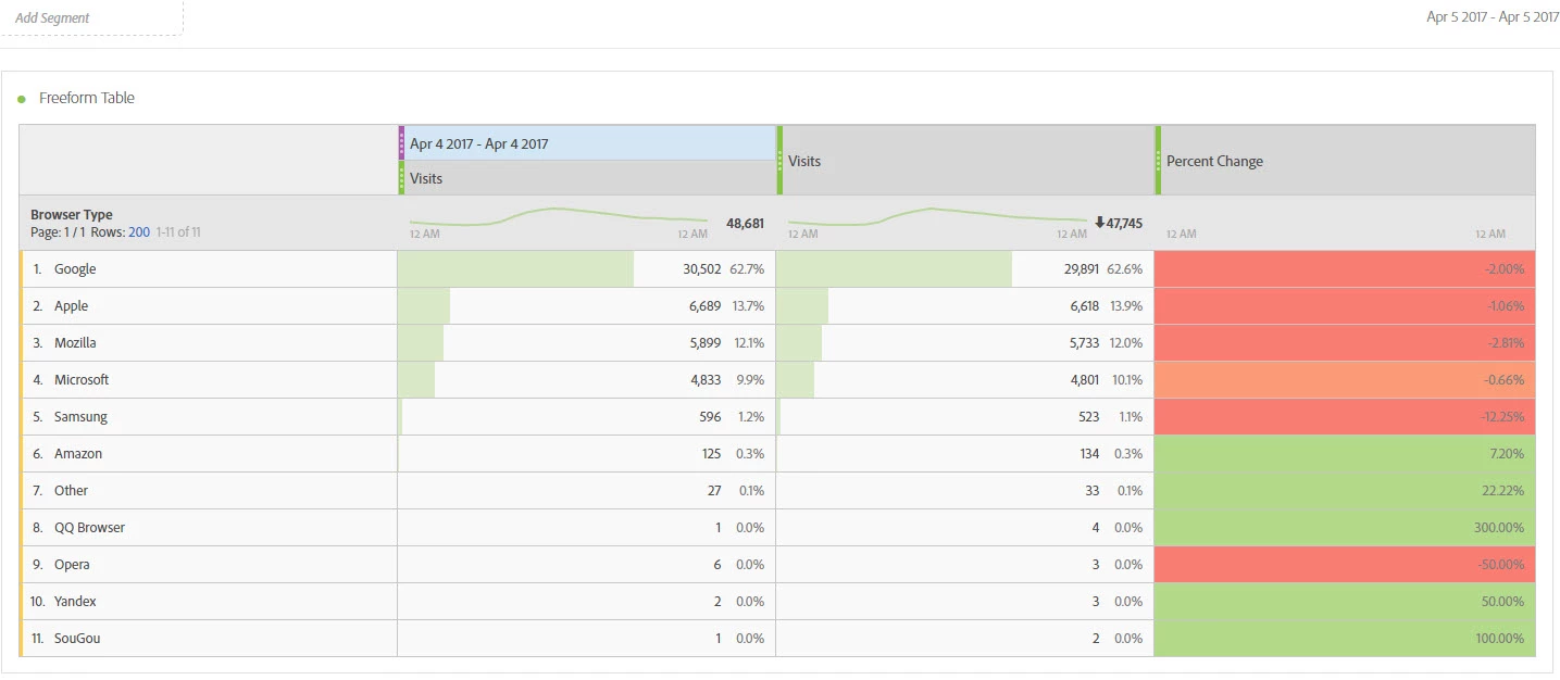 2) I choose a date range and now I have Visits (with date range above it), Visits and a Percent Change column showing correct numbers.