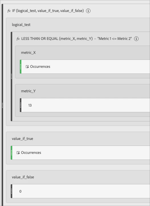 Then, I created a Calculated Metric that had an IF statement in it to filter to just dimensional items with 13 Or Less Occurrences: