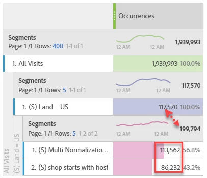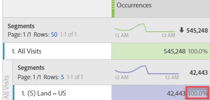 I use many segments, but Totals do not show a % (in top row) or always 100% (lower row). In this example I would like to see how much makes 42k out of 545k.