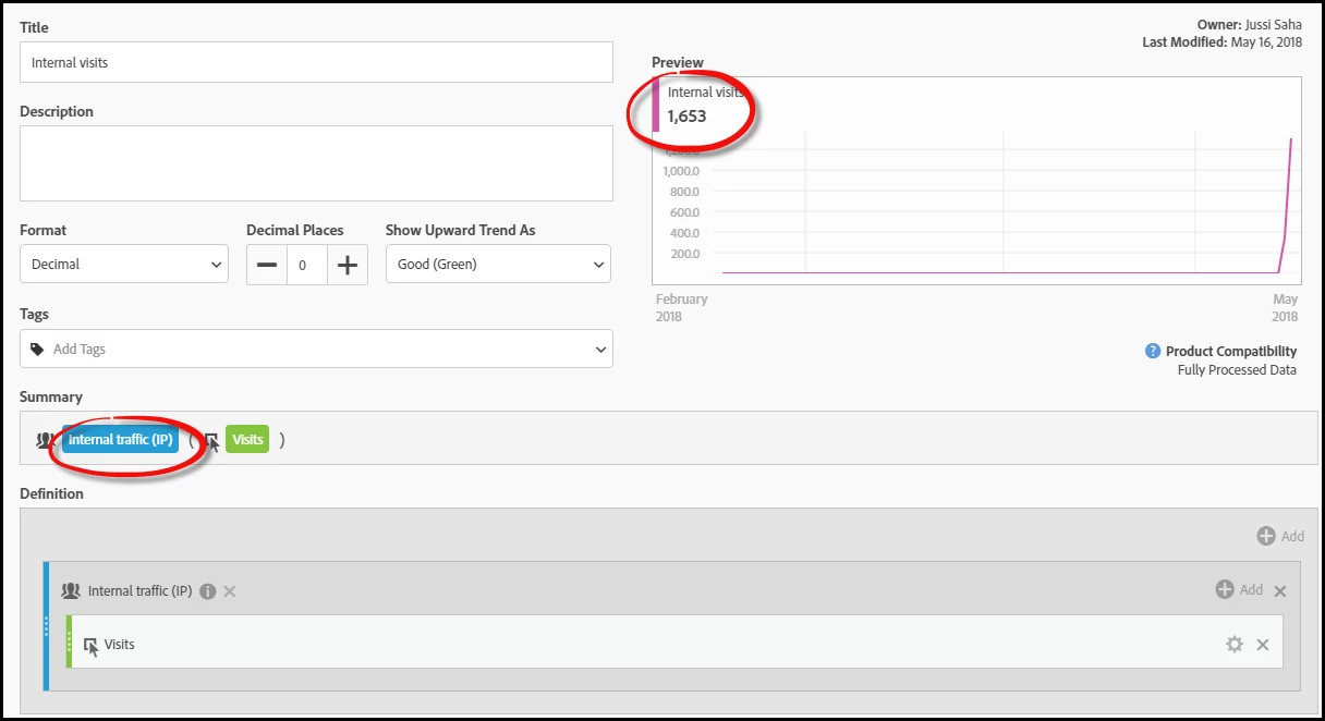And when I create a calculated metric based on this segment, I can see in the preview that I get the same number of visits: