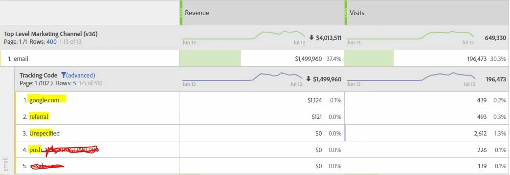 Exclusively for app reporting, we are seeing that wrong tracking codes are getting associated with the marketing channels. In one of our channel, push notification, a large amount of revenue is also getting attributed to email tracking code which is making us nervous. For example, in this screen shot, you that that if I breakdown marketing channel=email by tracking code, then tracking codes like (push_XYZ, google.com, SOC_123 etc.) shows up instead of JUST tracking codes starting with 'EML....'. Question is why???