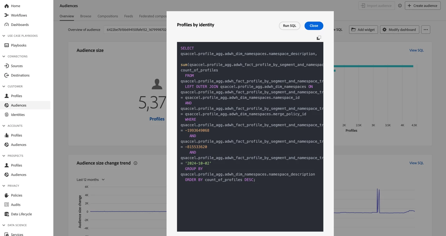 The 4 KPIs I plan to use for my audience comparison dashboard are audience size, audience identity breakdown, audience size trend, and audience size change trend. While I am using these 4, you are welcome to take additional or different KPIs from the audience overview page. I select the toggle for ViewSQL to view the SQL for the desired charts and copy the SQL, which I can use in Data Distiller Query Pro Mode to author my comparison dashboard.