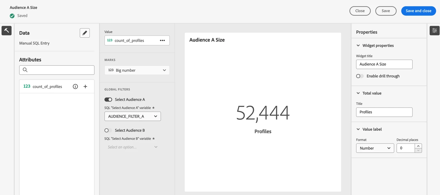 I can follow the filtering authoring tutorial to create my audience filter. The SQL I used is provided below. It brings in the audience name (segment name) to display for the user and the audience ID (segment ID) to pass to the chart SQL as a parameter. I have used two filters of the same type, one for Audience A and one for Audience B. The same four widgets will be used twice. One set will be linked to the filter for Audience A, and the second set will be linked to the filter for Audience B.