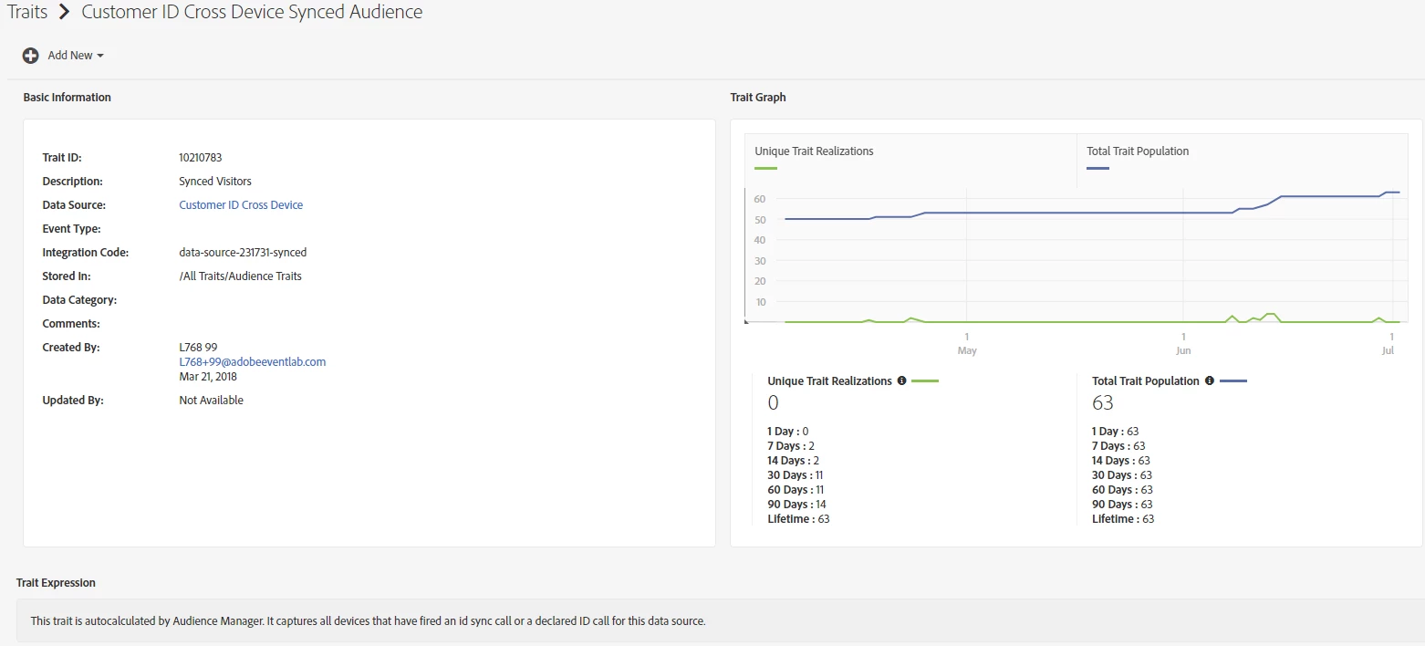 2. Check the Audience Trait for the data source. For your cross device data source, you would notice that an Audience Trait has been created that shows the number of ID synced devices for that data source.