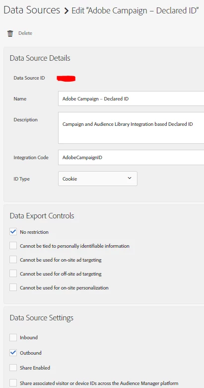 Question #1: This data source was setup by our adobe integration team, but I'm wondering if this should have Inbound, Outbound, Share Enabled, and Share associated visitor or device IDs across the Audience Manager platform selected as well? It seems like if we are passing a declared id, then inbound should be selected. And if we want to be able to share segments back to Adobe Campaign, the other options should be selected. Maybe I'm misunderstanding that though?