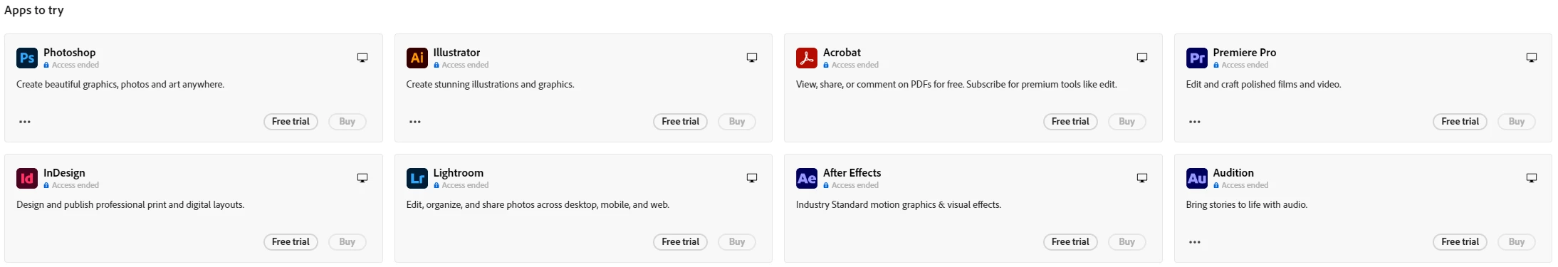 hi team, i have an issue with my account , i have a plan of adobe creative cloud and i cant use any Adobe app. please check it, in under i screenshot it.