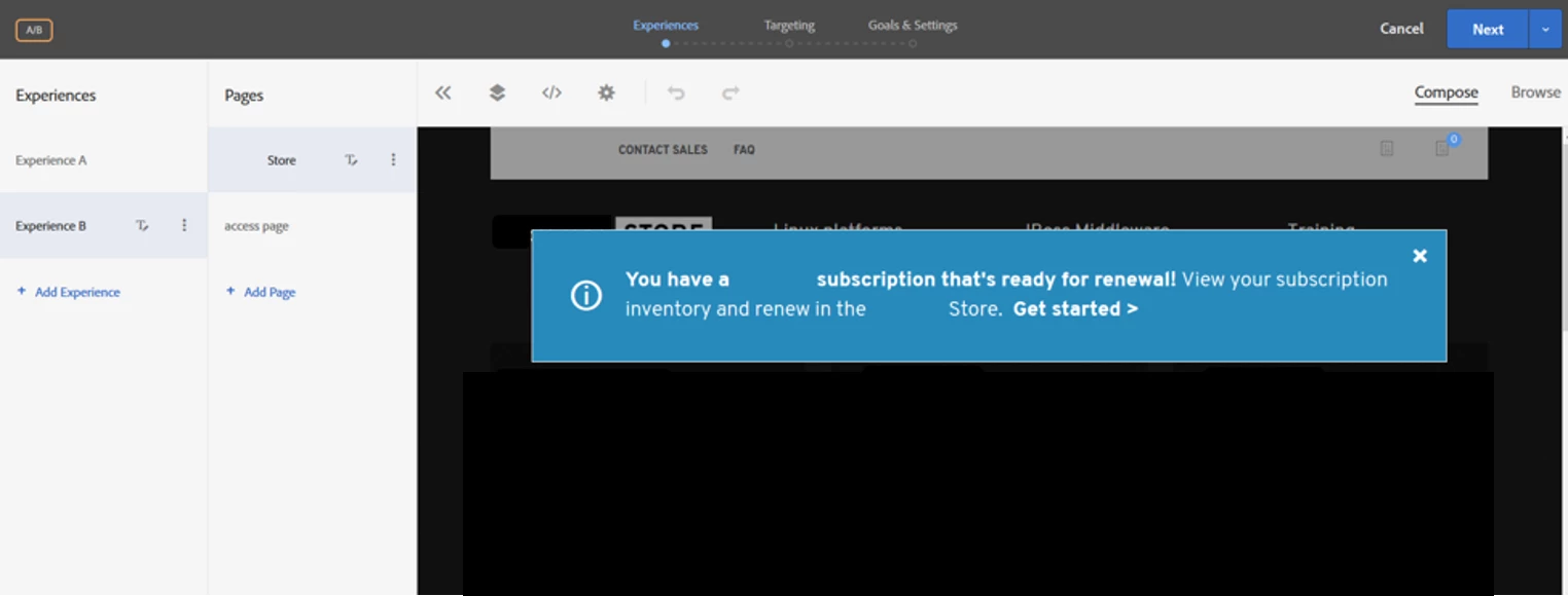 1. Create the relevant experience in Target for the use-case. In our example, the experience is created for renewing the subscription after a number of days (120, 90, 60 and 30). The message will pop up on the website for users who qualify for the experience. To learn more about how to create experiences in Adobe Target, click here.