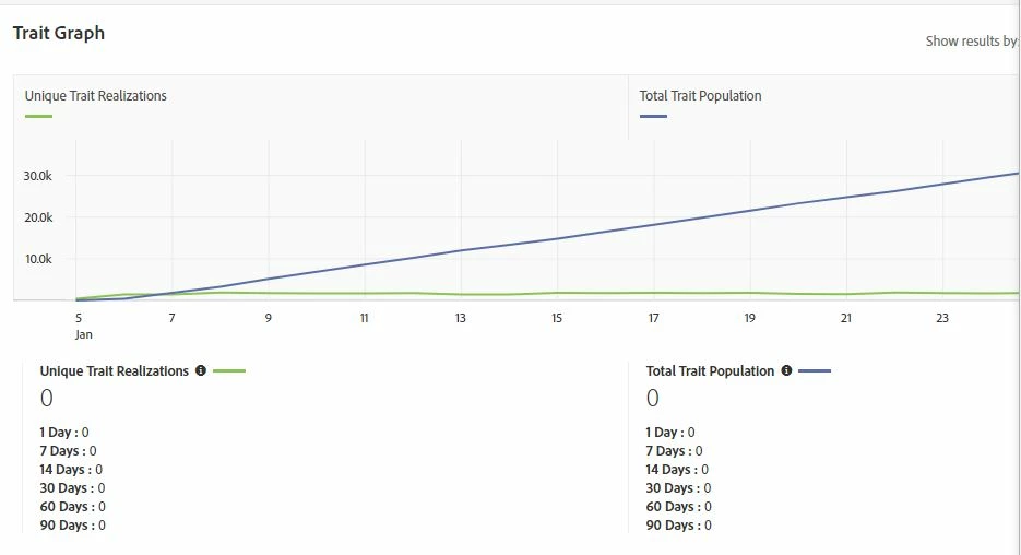 We do not yet have our AAM synch call set up and we are still doing server-side forwarding. We do have the right AAM Org ID set up within our Launch Web SDK. This particular trait was set up after we moved to the WebSDK. It is fed from website traffic. Is the problem that WebSDK uses the ECID rather than the MCVISID? Notice that the Total Trait population in the graph shows that there are a little over 30K in the total traits but those numbers do not show up in the 1 Day: thru 90 day legend below. How do we get this working properly?