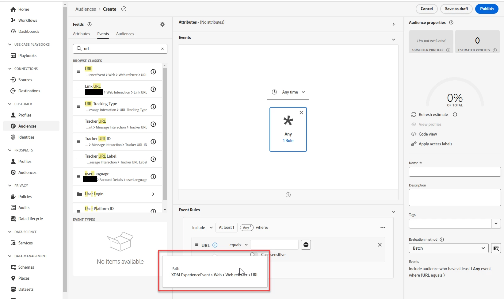 When I try to create an audience in AEP audience manager, it appears I cannot leverage on the OOTB Page URL dimension (xdm.web.webPageDetails.URL). The only available URL attribute in Audience Manager is the web referrer URL (see screenshot).