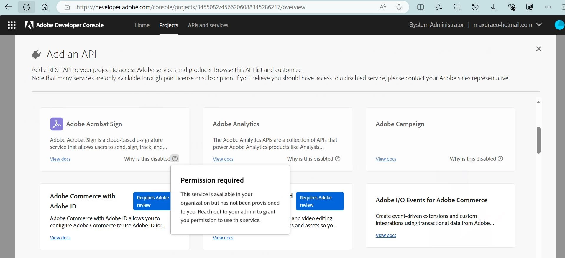 Adobe Sign permission error when trying to add API to a project.