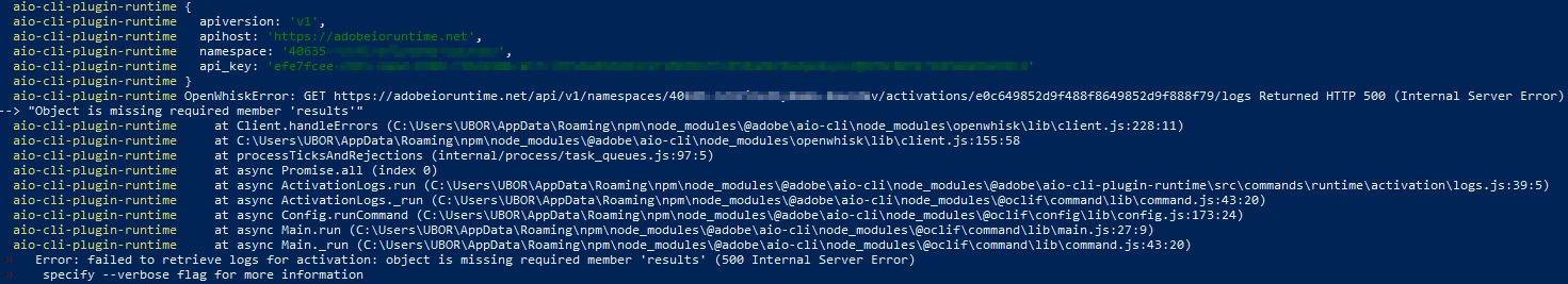 2) with no changes at all I then executed "aio app run" (no errors) and invoking the exact same action (with success in the UI), nothing happens in the logs. I checked the list with "aio runtime activation list" and could not find any new entries at all ... (which looks strange, what might be the issue?)