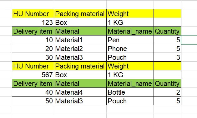 Customer's ask is to print 1 HU and its associated delivery lines on a page. For this particular example, there would be 2 pages, page1 for HU 123 and page2 for HU 567. I have achieved this using conditional page break and the data gets split and passed on to new set of pages.