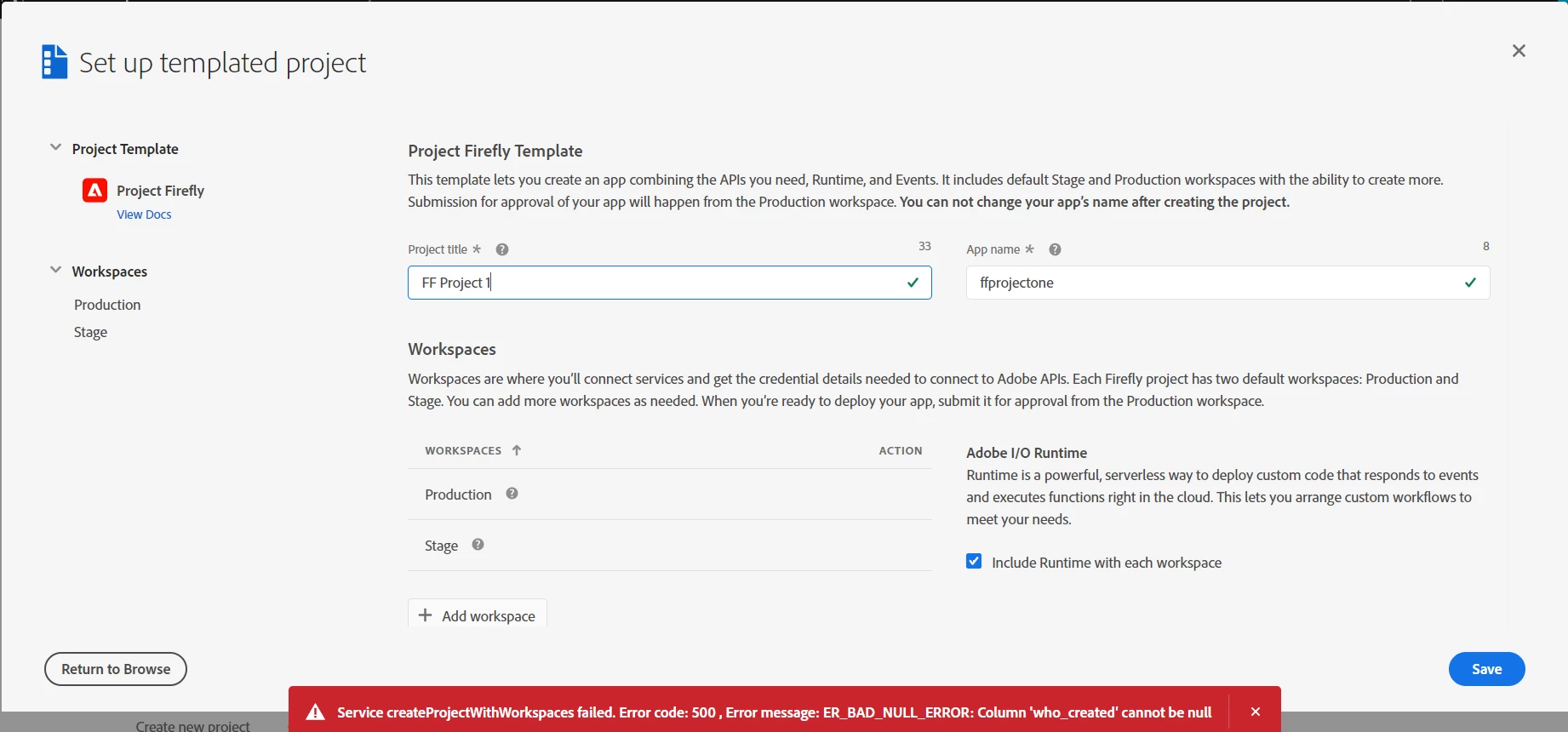 I am trying to create a project with firefly template but when I type in the project title, app name and click save, I get the following error: