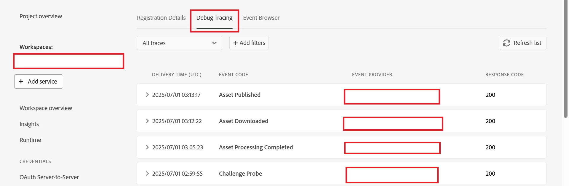 and from AEM if I upload, publish, download... an asset the event is getting triggered and able to track it under debug Tracker
