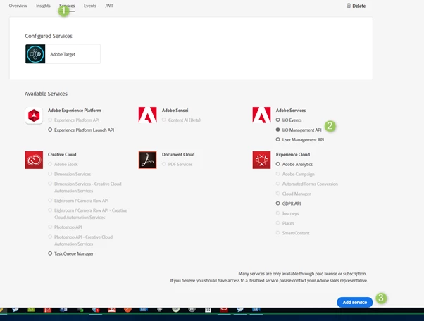 - Edit configuration > Services > Adobe Services: Add I/O Management API > Add Service