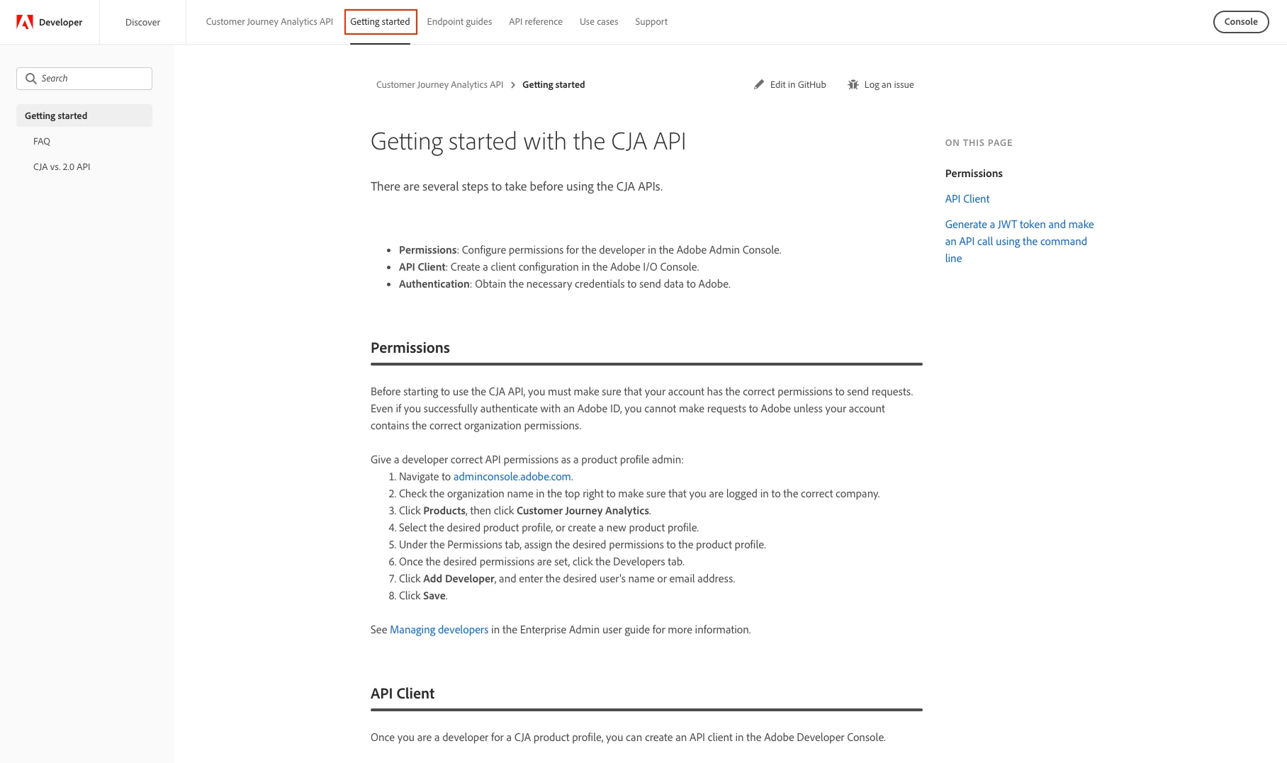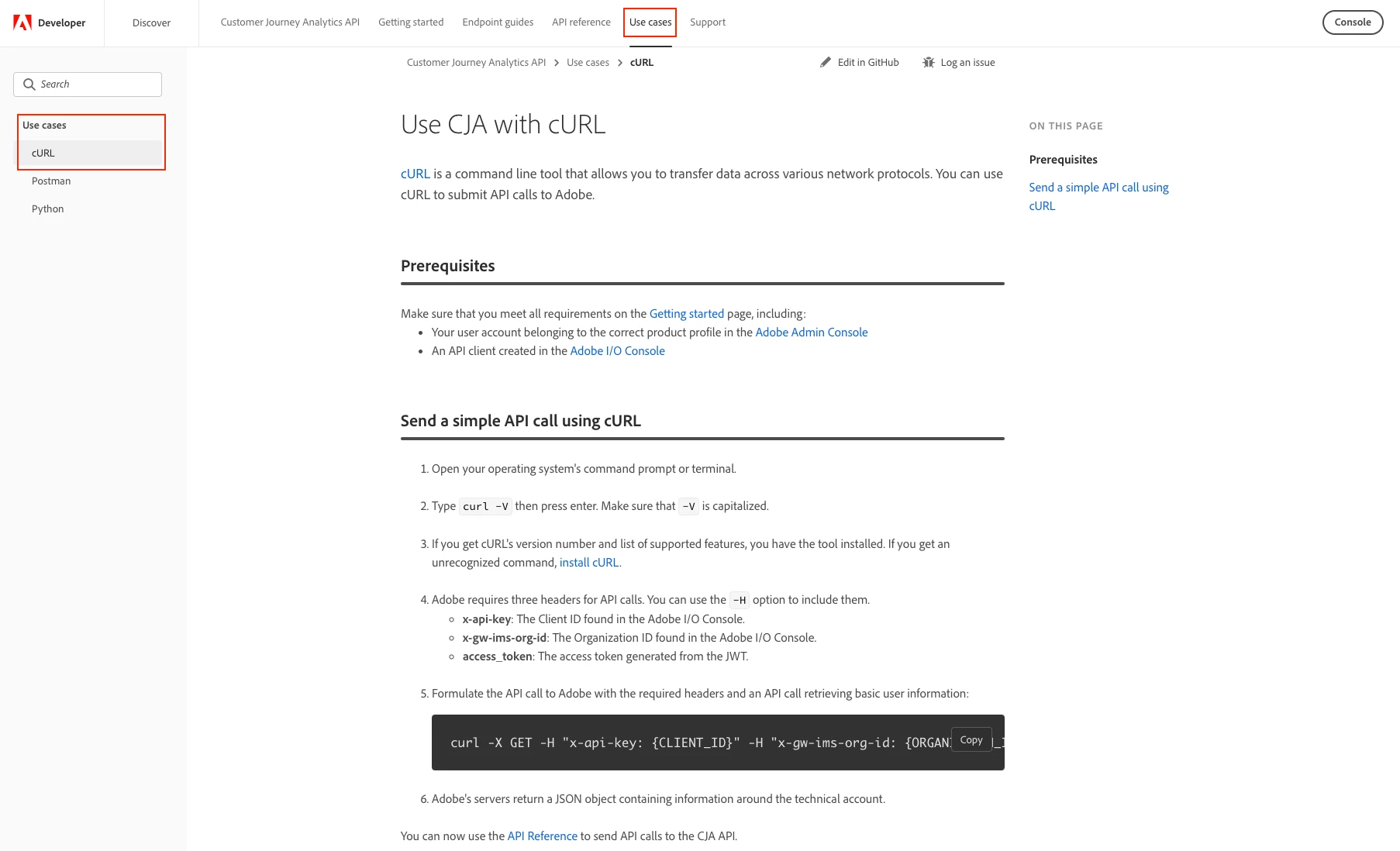 The page that's linked from the Developer Console is the same content as the GitHub Repo. That page and its subpages have a Getting Started Guide, Endpoint Guides, OpenAPI specs, and same cURL commands. The key items missing are Postman and Python sample commands but there should be enough to get you started.