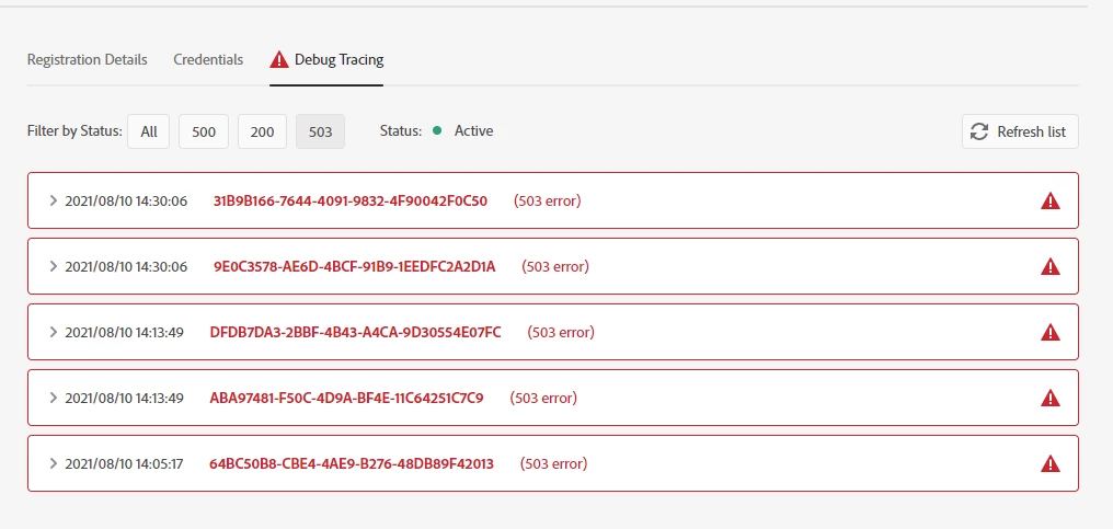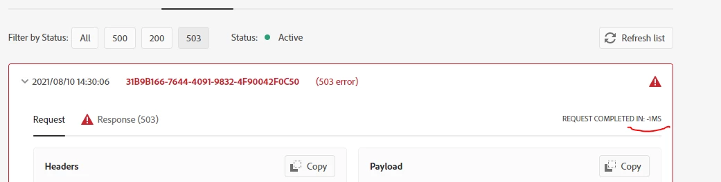 We had set the application flow in such a way, whenever new data ingestion happens it gonna triiger an application which is deployed in Adobe IO by using HTTP URL. Recently we started to see a lot of timeout(with 1ms in-flight time) errors (screenshot attached). Any idea why it is happening?