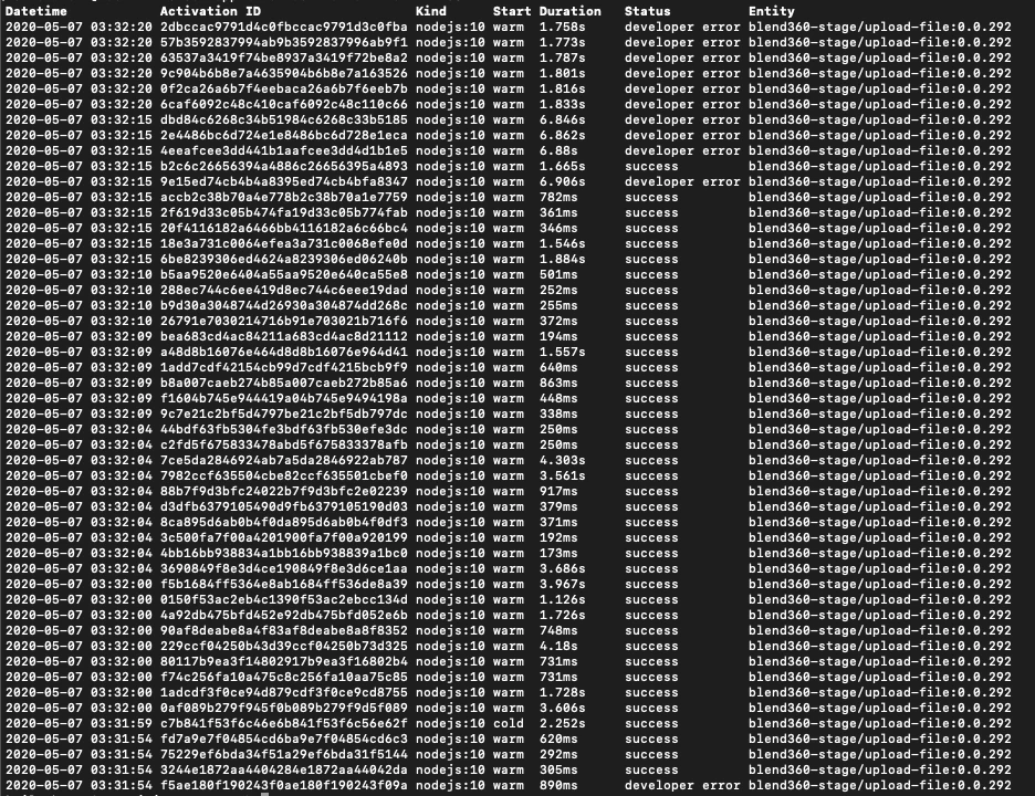 When I look at my activation log (limit 50) after running action 1 (consequently invoking 200-250 action 2), I see 85% success, but 15% have a "developer error" status: