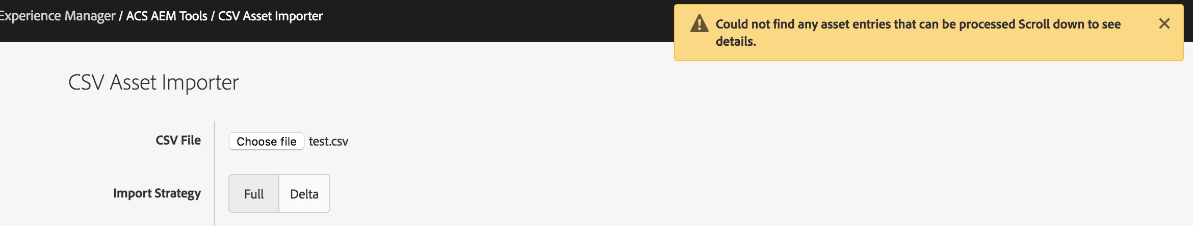 But while I click on import assets, it says "Could not find any asset entries that can be processed Scroll down to see details.". I think it is because the file is in my local system. The csv has absolute path with reference to my local system. Is there a way to upload images from local system to Remote AEM server using CSV Importer ? If yes, how?