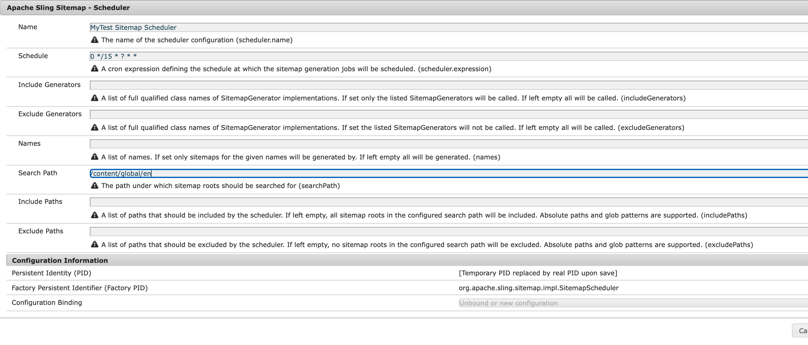 We’re upgrading AEM Service Pack to use Sitemap feature and trying to setup a scheduler for Sitemap Generation (org.apache.sling.sitemap.impl.SitemapScheduler) but It’s not able to execute and in error.log, getting this: