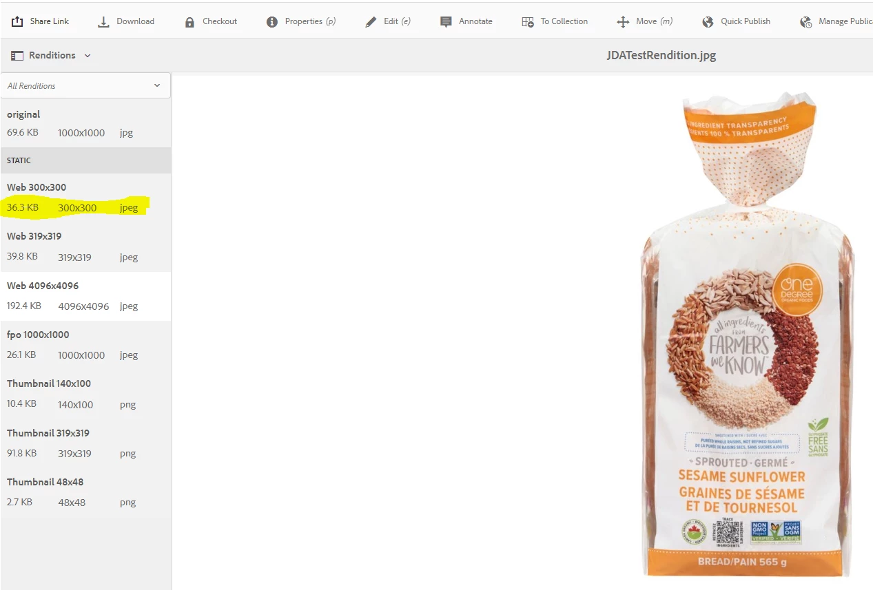 The custom rendition is created as 300*300 with jpeg extension.
