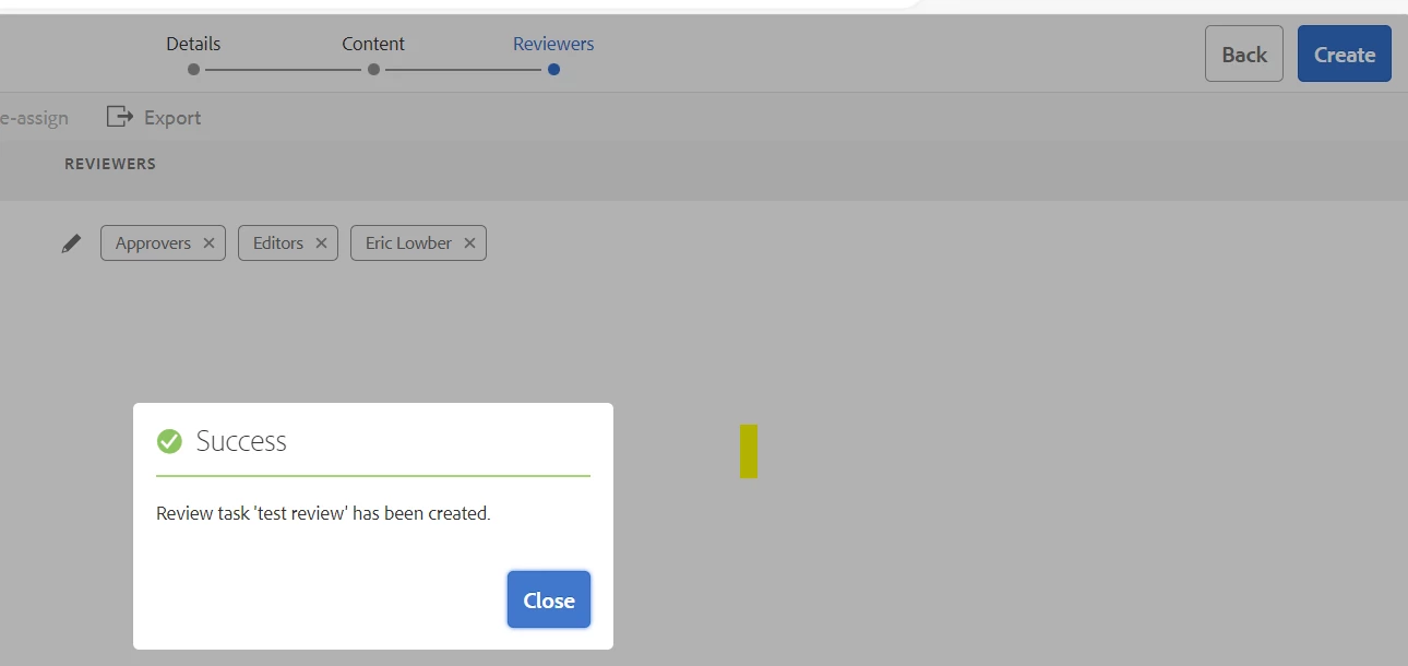 3. Click "create." I get a dialogue that says "success! Review task 'test review' has been created. "