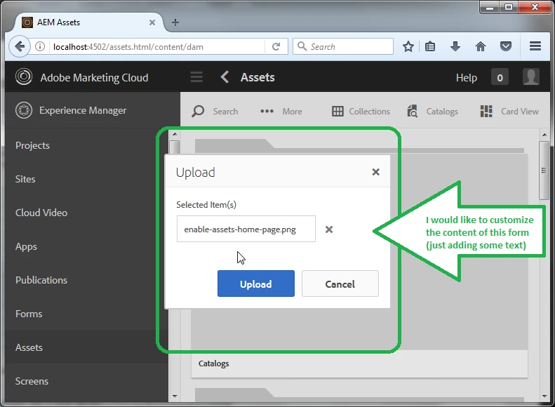 I'm working in a requirement to customize the Assets page. In particular, it would be simply adding a disclaimer text in the upload pop-up that shows right after a new asset is uploaded. Common sense, tells me the requested change should be ridiculously easy to implement. However it's frustrating that I still haven't found how to implement it.