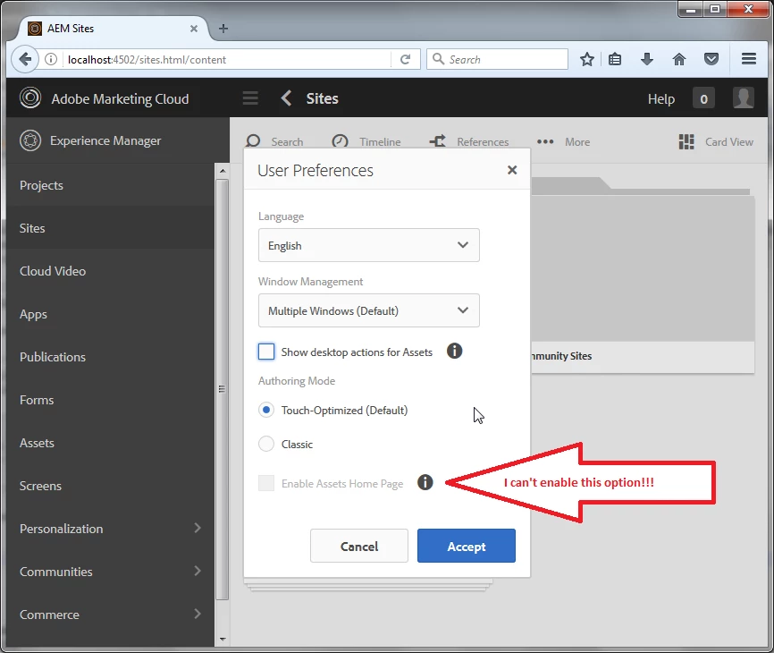 7. Open the User Preferences dialog, and select Enable Assets Home Page. Save the changes.