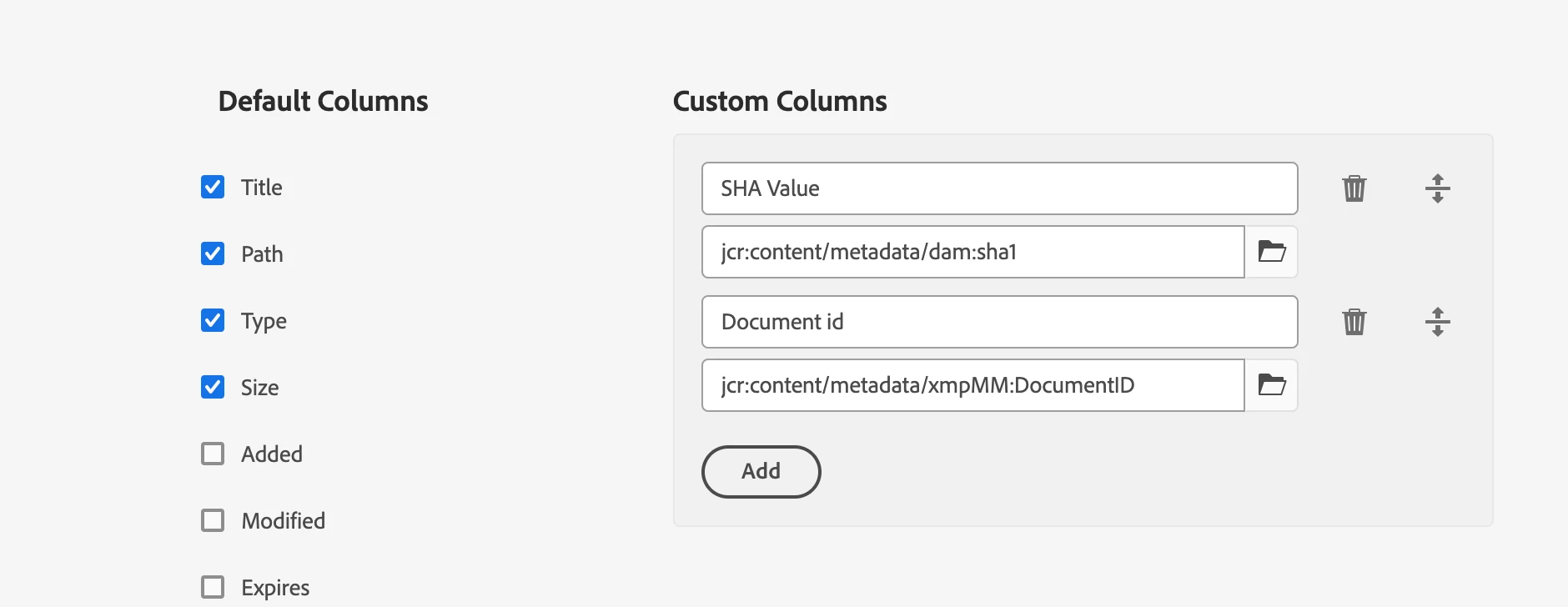I want to run a report of assets in a folder with custom columns for the metadata properties dam:sha1{{String}} and xmpMM:DocumentID{{String}}. I can see these columns and their values when I export all metadata of a folder, but due to a large volume of assets I don't want to export all metadata. What would I enter into the 'Property to Map' field to get these values in my report?