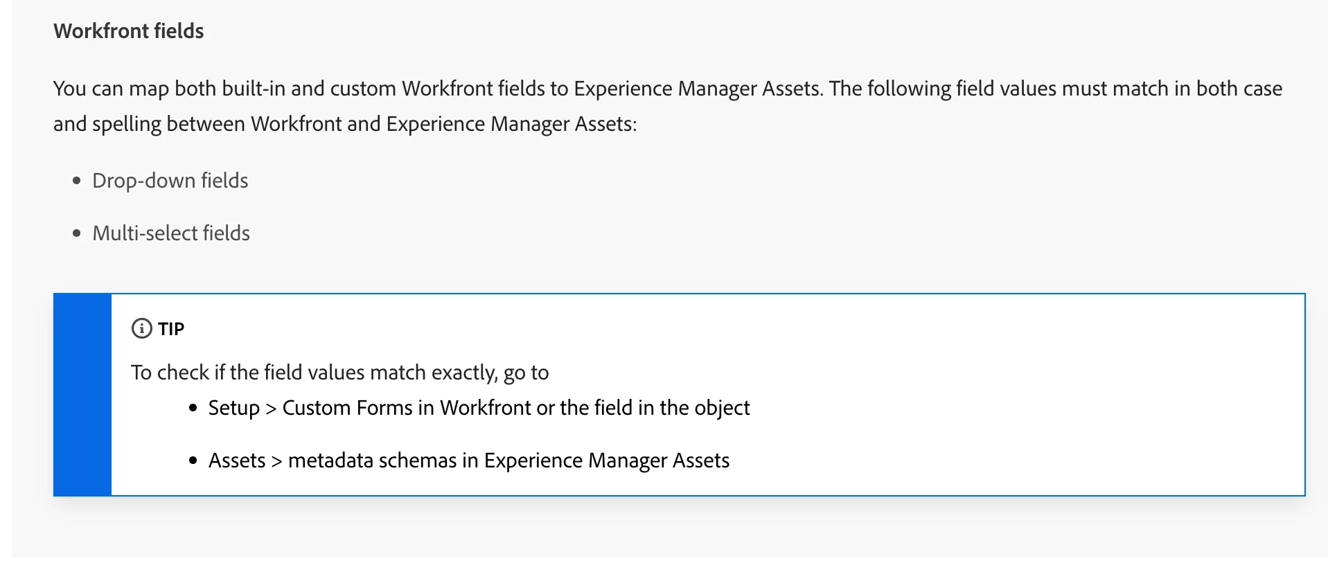 We've been manually uploading assets to AEM Assets for a few months, but we are ready to use the native metadata mapping integration provided by Workfront. We've tested the native integration and we are able to map metadata from Workfront to AEM Assets fields, but we have been unable to map metadata from Workfront to our AEM Assets tags. For example, we have a custom form with a dropdown field that allows us to capture the intended audience for a specific asset. We would like map that dropdown audience field in Workfront to our audience tag in AEM Assets. Has anyone done this or know how to do it? This could be a big win for our team if we are able to map this information. Thanks in advance!