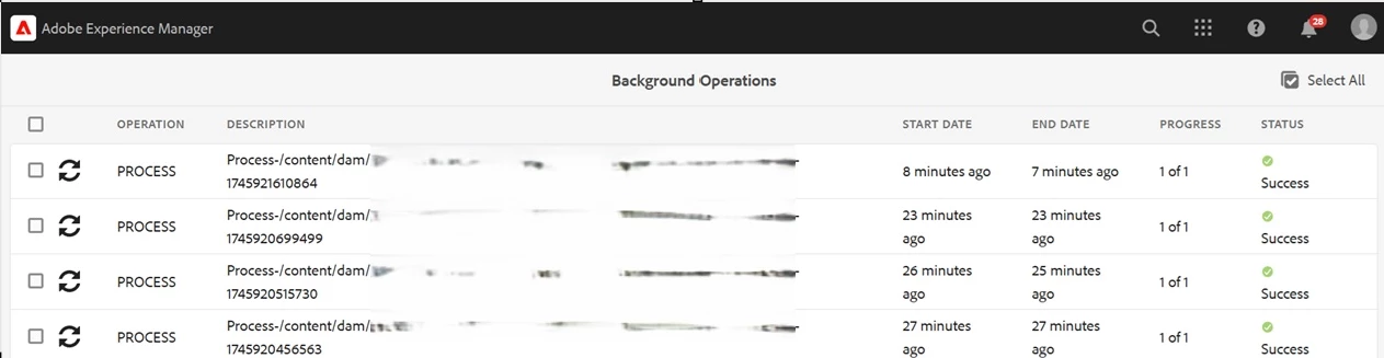 You can check for status of these jobs in background operations console on the environment - /mnt/overlay/granite/async/content/asyncjobs.html?consoleId=cq-assets-asyncjobs-asyncjobs