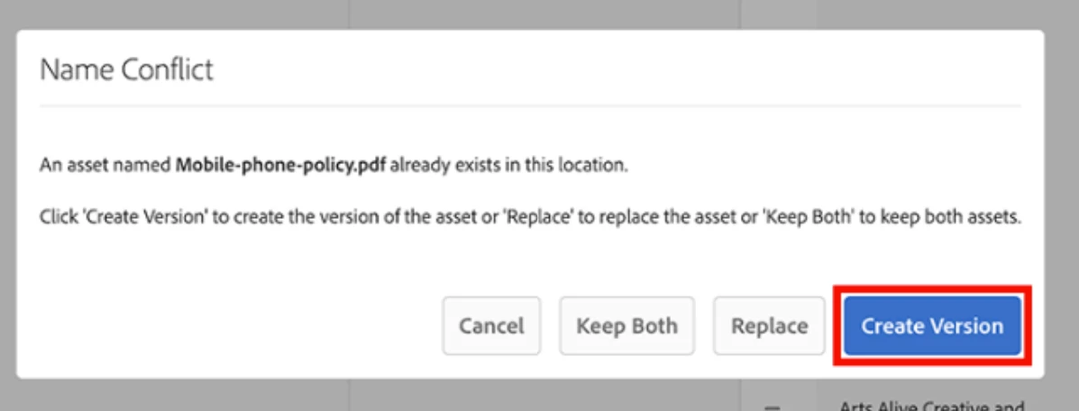 Is it possible to overlay the file upload dialog in aem so that when we get a name conflict we can show other options, e,g create version for working copy and create version for upload file etc, replace will also work differently.