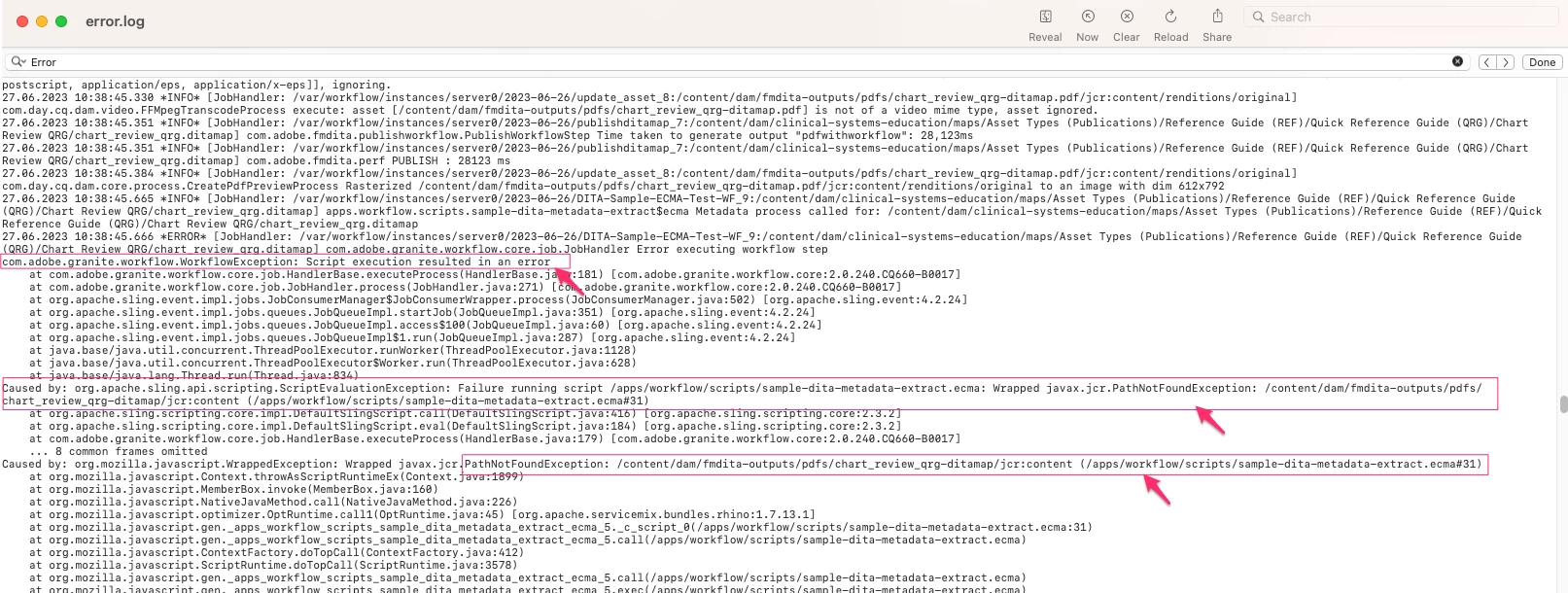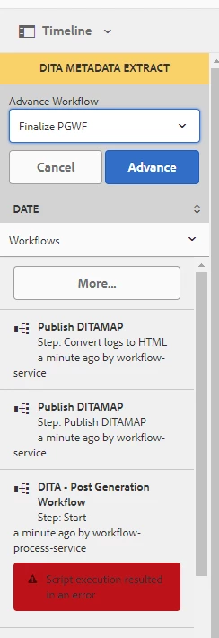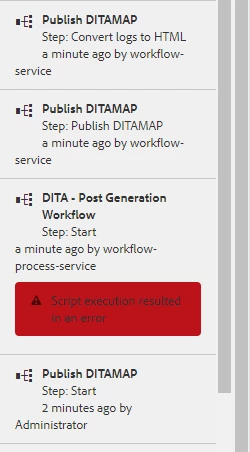 I've been working on getting a sample AEM workflow up and running. I'm using the sample, post-generation workflow documented here: Post Generation Workflow | Adobe Experience Manager. This particular workflow is interesting because it captures the AEM metadata. My content is authored in DITA using AEM Guides. I downloaded the sample package and loaded it into my localhost using CRXDE. I followed the instructions in creating an output preset (PDF). When I generate output from Guides, I am getting an error message in Assets: