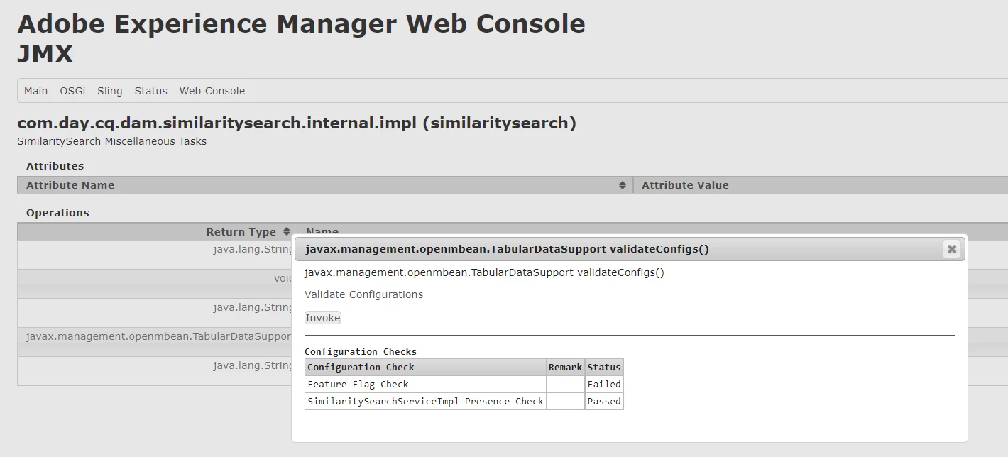 Also, I checked/validated the integration by going to Web Console > Main > JMX then searched for "Similarity search" and here in this, I checked on validate then getting the below popup.