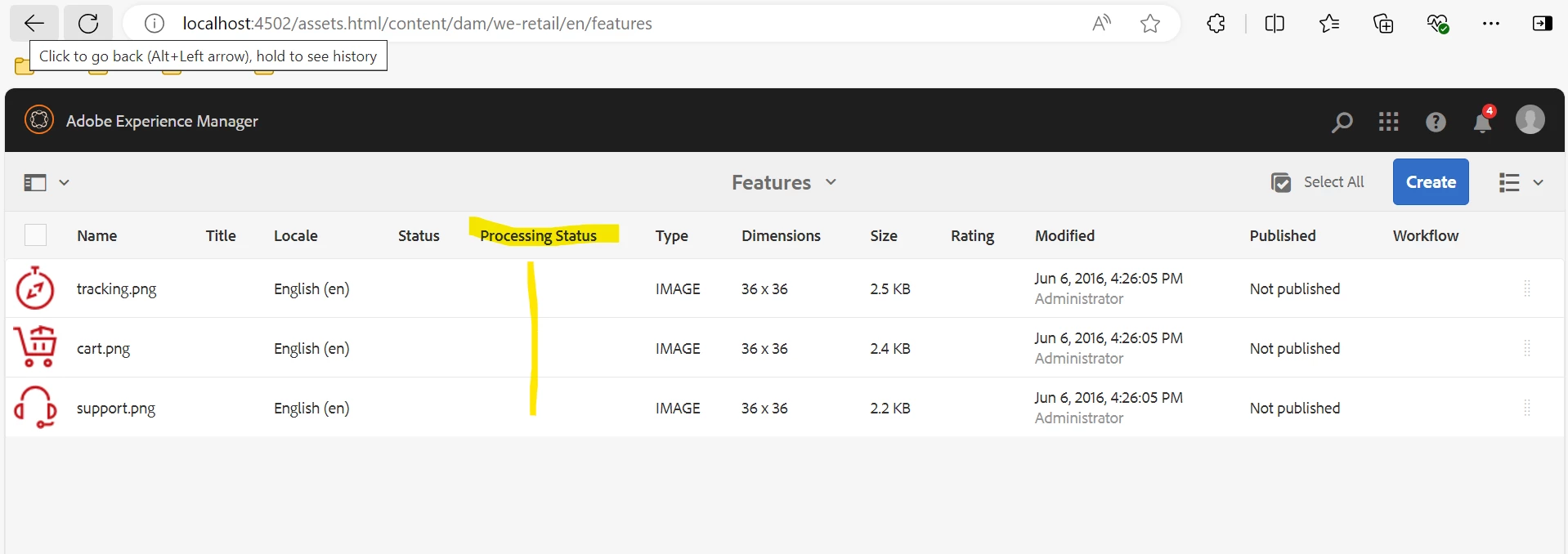 Sorting on Processing Status column in AEM DAM Console