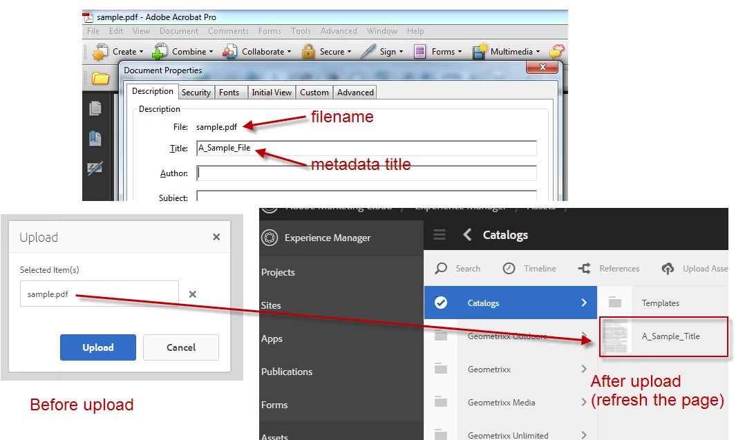 Uploading PDF in Assets does not show the filename "sample.pdf" but instead the metadata title.