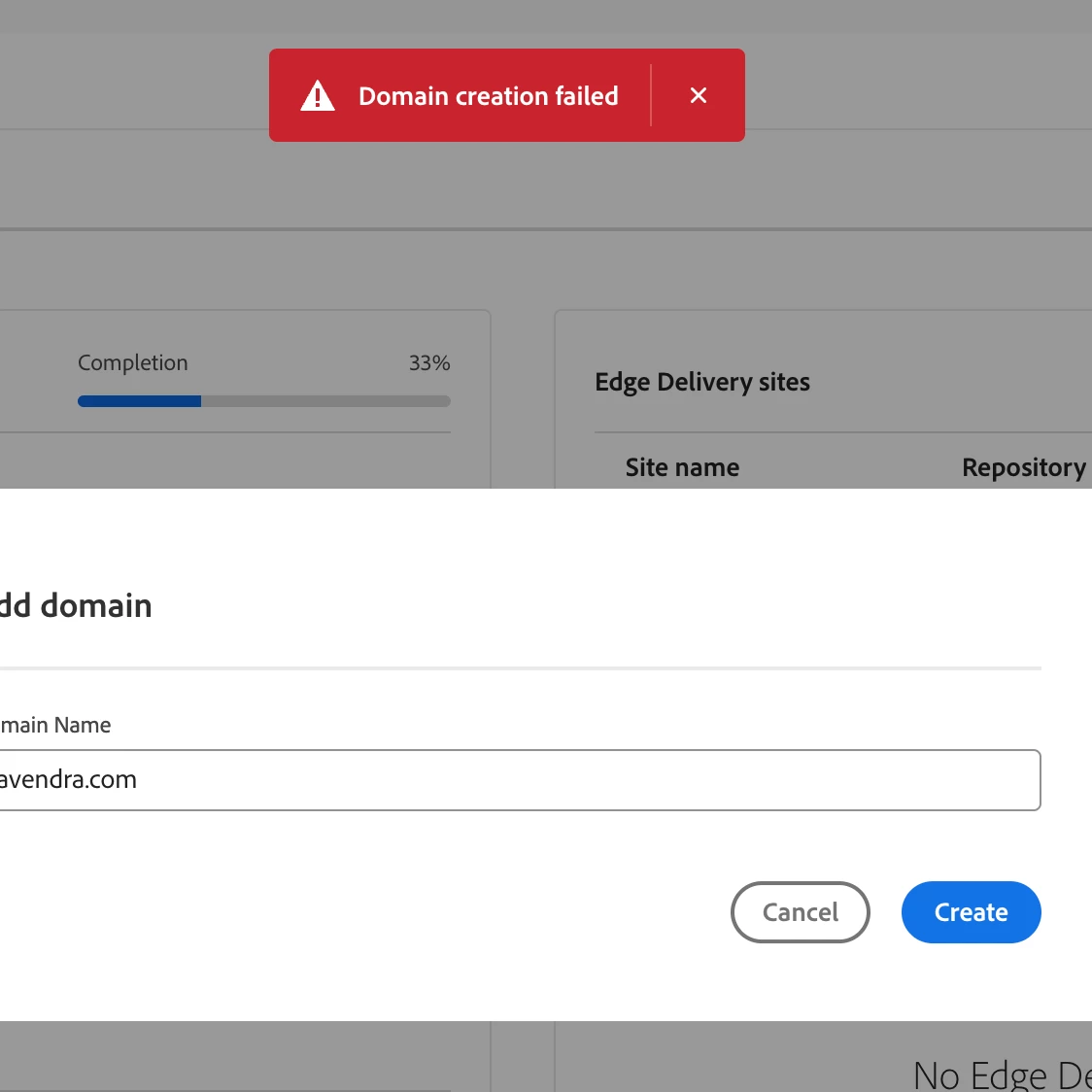 Another error comes up when I try to do Step 4 which is "Add domain". I fill out the domain name the client owns, and which will be our EDS's final site destination push, but I receive the error "Domain Creation Failed". (See attached screenshot)