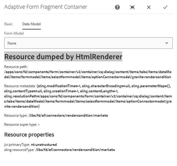Resource path: /apps/core/fd/components/form/container/v2/container/cq:dialog/content/items/tabs/items/dataModel/items/formmodel/items/selectformmodel/items/optionConnectormodel/granite:rendercondition