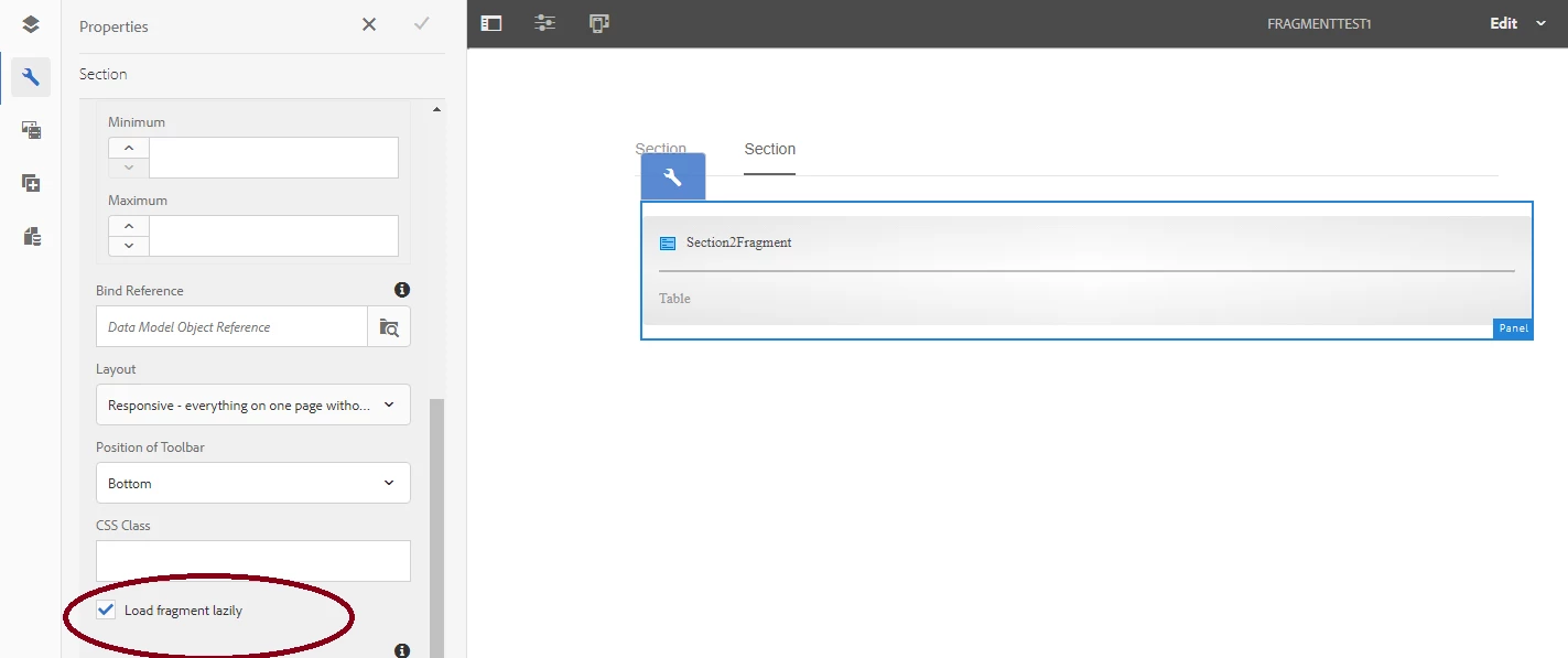Creating section with a table as fragment works ok, but after checking Load fragment lazily