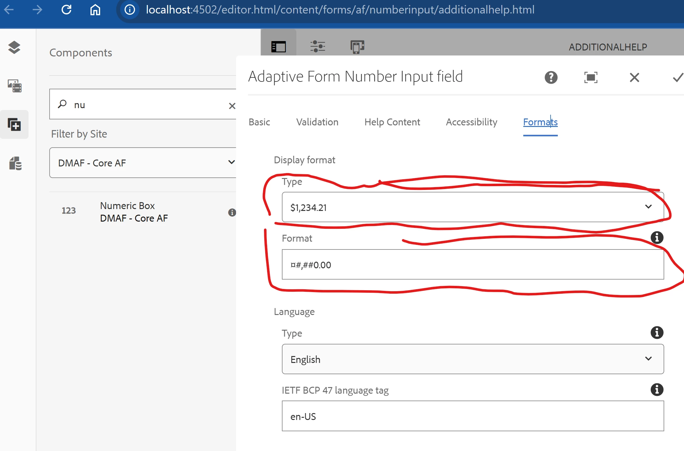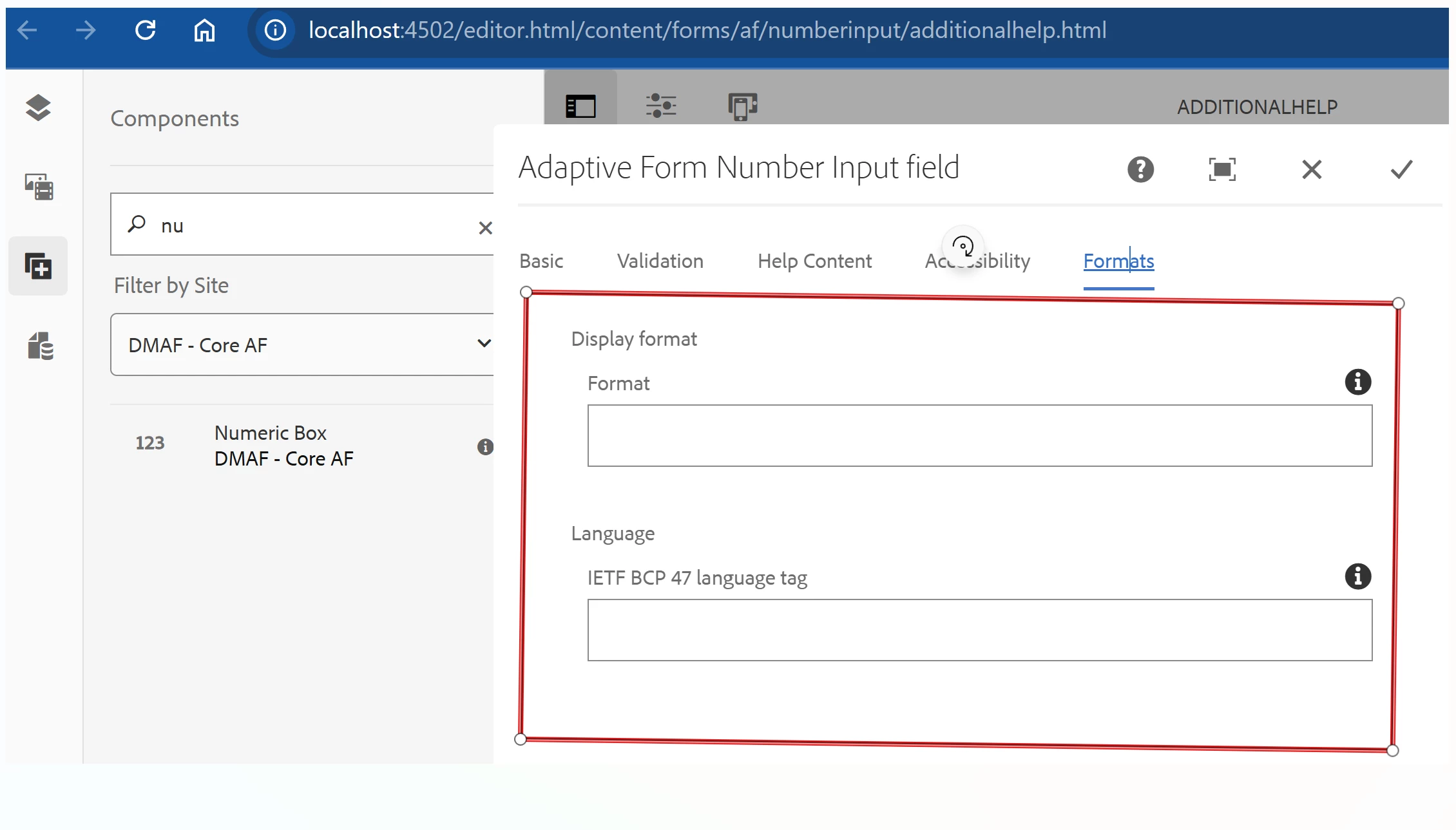 Number Input Core Component's Display Pattern dropdown not appearing in the OOTB Adaptive Form template (blank-af-v2) but working when the same component is used in your own custom project (/conf/myForm/...) — even though the versions are the same .