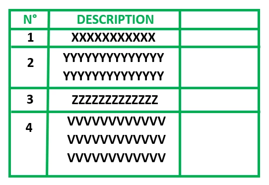- In the table, each item has a description which may contain 1 to various lines.