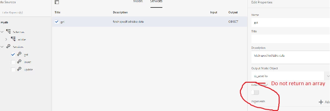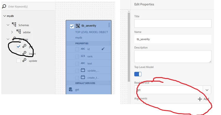 Step 2: Create an FDM using RDBMS, make sure you add the get service here as we will use it in the form for invocation. Remove the arguments list from the model properties.