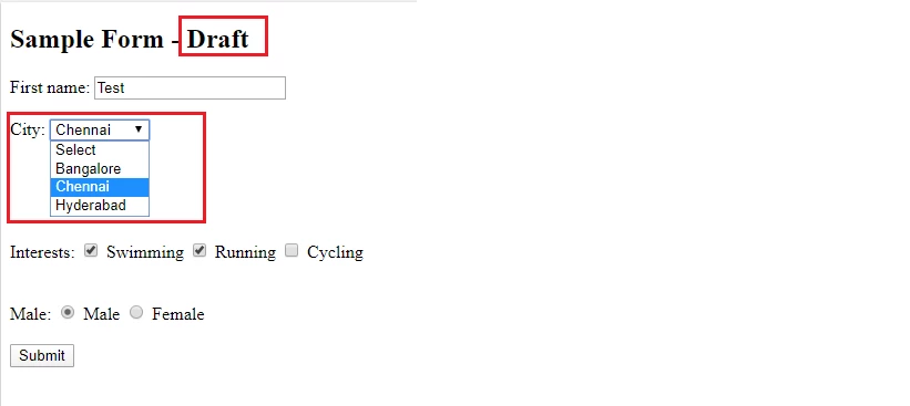 - 2nd Field(City) - Dropdown(Values fetched from Webservice. Assume values are Bangalore, Chennai, Hyderabad)