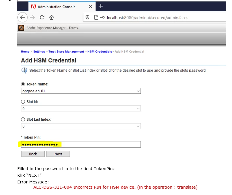 We always get the errormessage ALC-DSS-311-004, although we have entered the correct PIN for accessing the certificate on the Luna-server