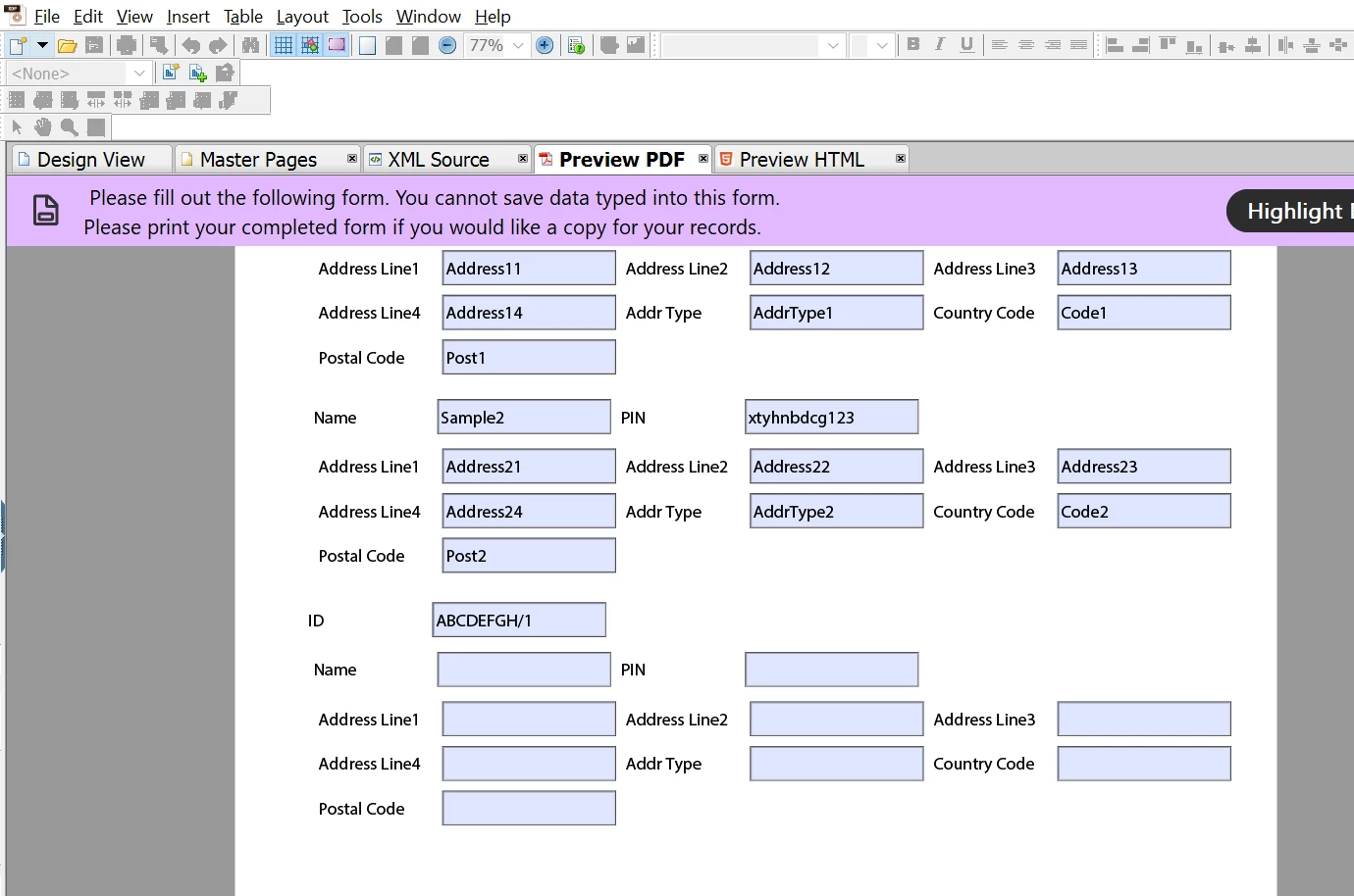 If you intend to have the first block 1..3 in the first subform and the rest in another then you must restructure your data as the first access consumes ALL section tags even if not shown.