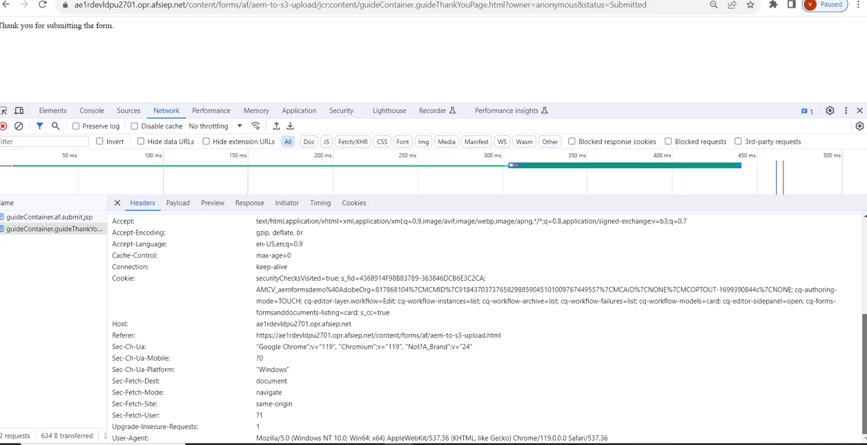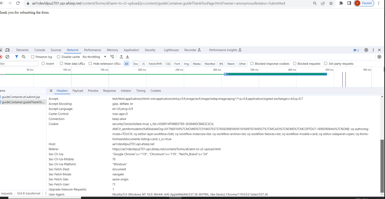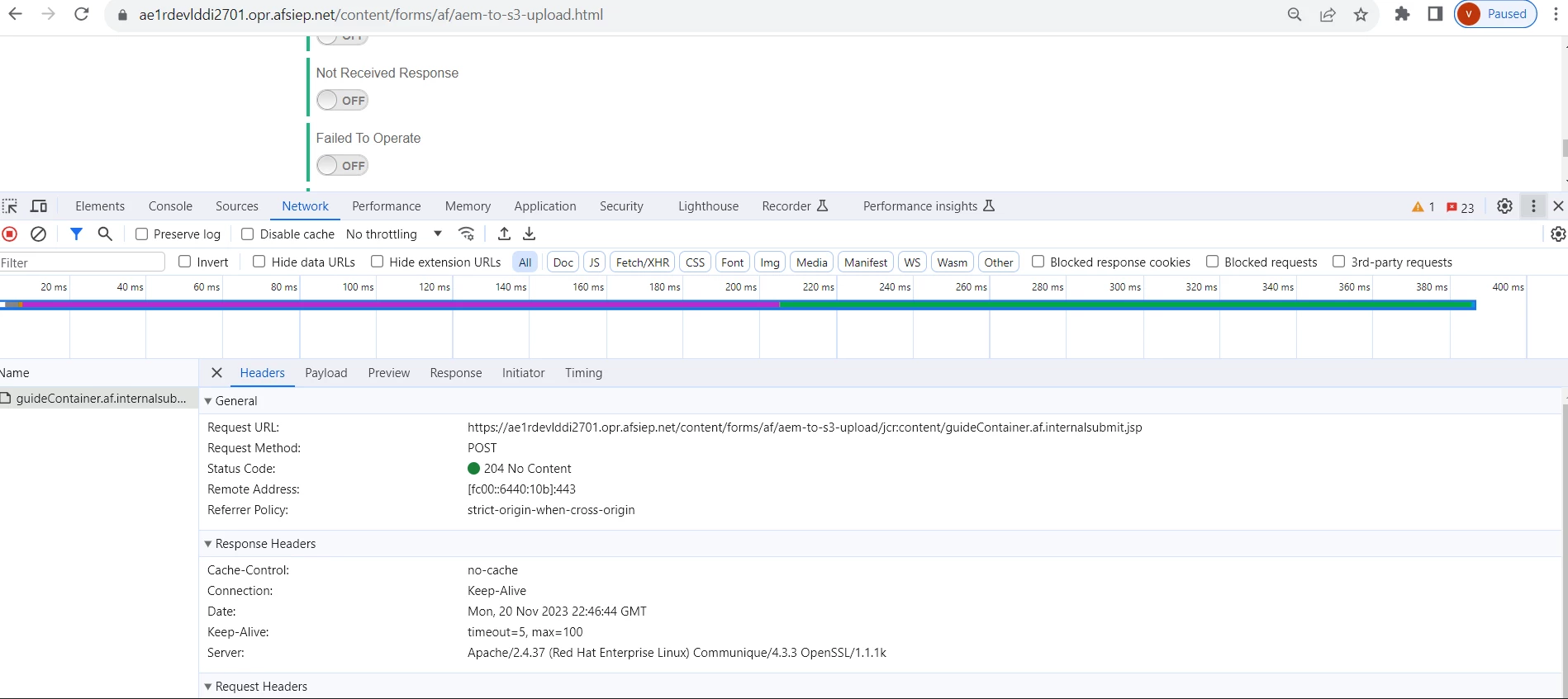 We have a form which when submitted invokes a workflow and submit the DOR to Amazon S3 bucket. It works fine via publisher though giving 204 form dispatcher. Please advise